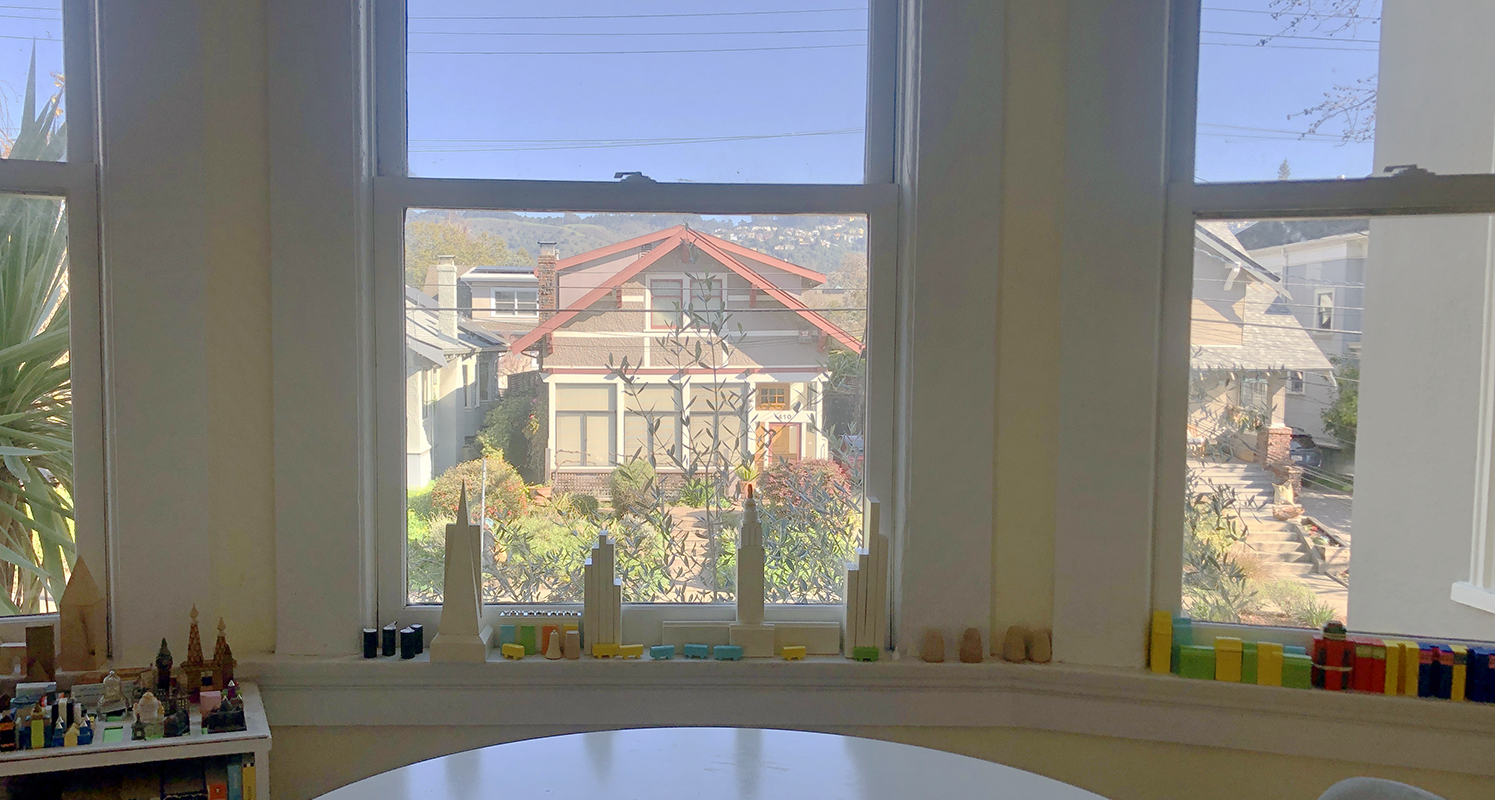 Stepping into our 350-square-foot apartment, your eye is immediately drawn to the view of Rockridge at the base of the Oakland Hills. Our bay window opens to a 180-degree panorama, balancing long, sweeping vistas with a cozy corner that invites slower, ground-level looking.