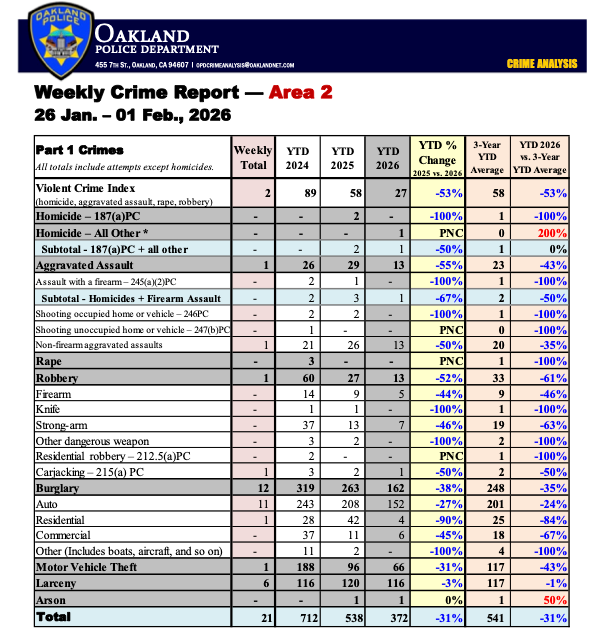 EDITORS NOTE: OPD’s Jan. 1–Feb. 1 year-to-date report shows the Violent Crime Index in Area 2 (which includes Rockridge) down 27 percent from last year and 31 percent below the three-year average. Year-to-date averages show aggravated assaults are down 43 percent, robberies 52 percent, and motor vehicle theft 31 percent. The area has recorded one homicide and one rape over the past three years. Auto break-ins remain high. See chart below (includes YTD totals):