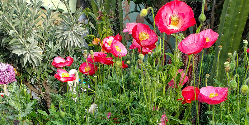 Nowhere else in California have women played such a visible role in shaping the look and feel of urban design. These lush front yards are my retreat from the world — safe havens where my mind and body can drift amid their messy beauty. My eyes linger on the fuchsias that hang like earrings, the tall grasses that rise into skylines, and the pink hibiscus whose petals swirl like the dresses of dancing girls.