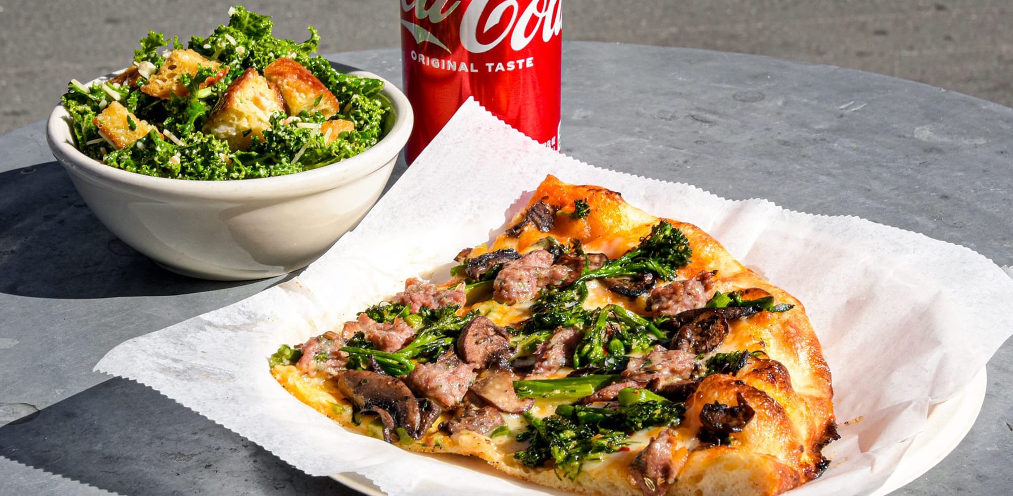 Restaurant Week Special: Slice of pizza + half pint of Kale Caesar Salad + can of soda. ·