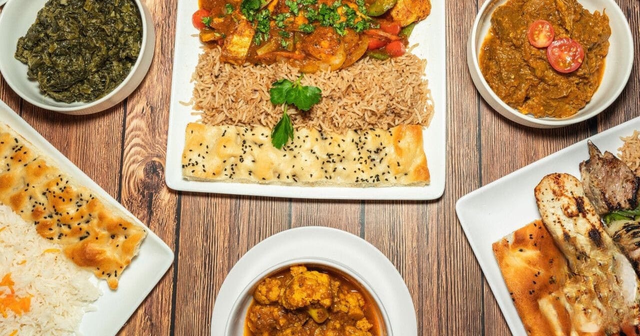 Includes Glass of Champagne, a Starter (Eggplant Pakora, Potato Pakora, Samosa), Entrée (Chicken Kabob, Salmon Kabob, Vegetarian Combo Qurma), and Dessert (Milk Pudding with Almonds, topped with crushed roasted pistachios).