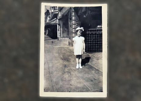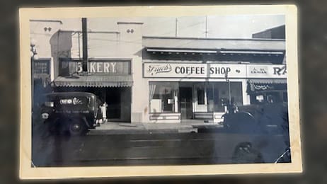 Gayle Olsen on College Avenue in the early 1940s, pictured on left around age 5. The original coffee chop, close to BART, is pictured on right. Photos courtesy of Barbara Stelzried.